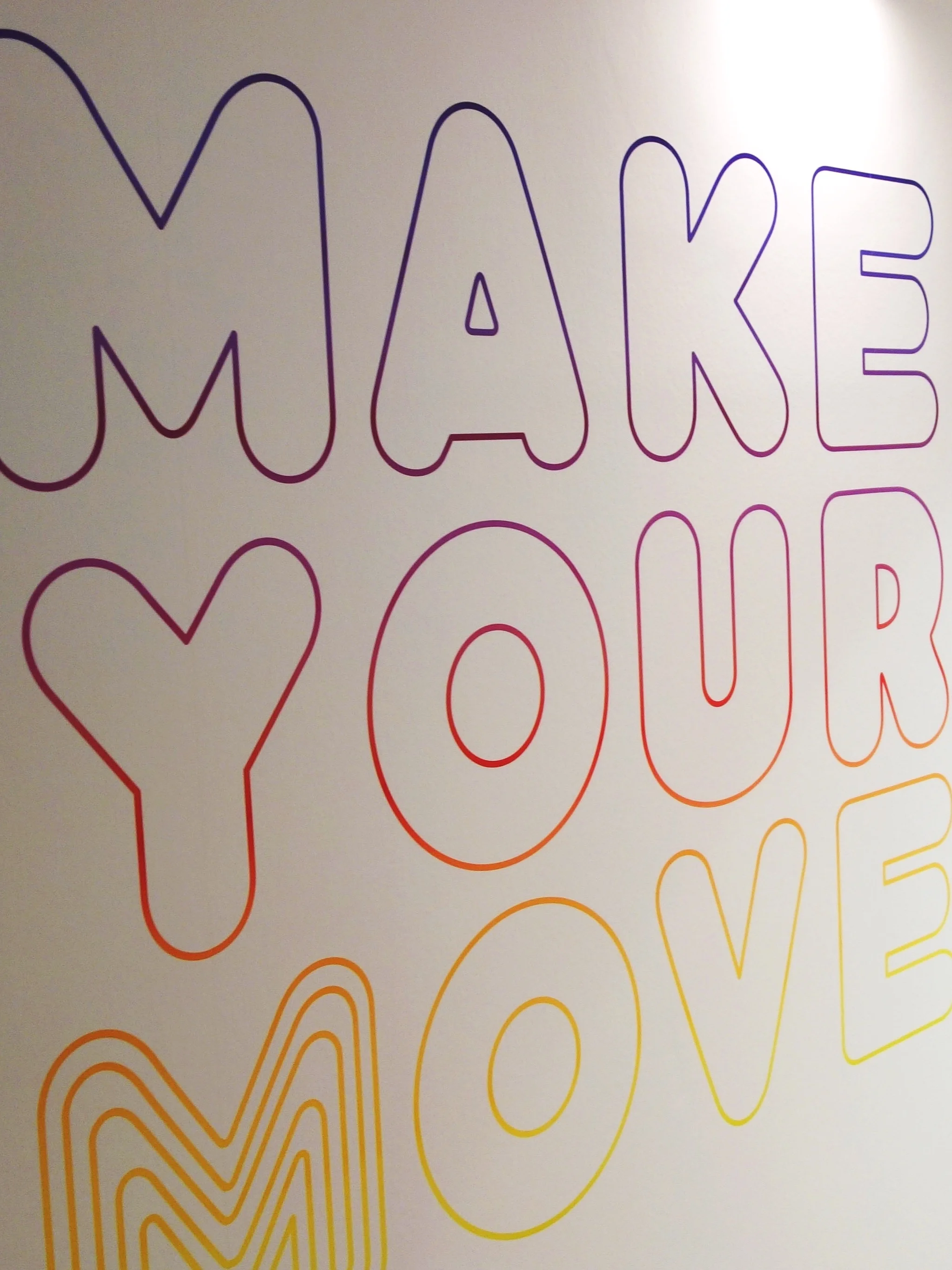 Lettering opportunities were used to decorate some of the main areas of this large office. “Make Your Move” served as an inspirational quote in the entryway to the main office core, inspired by the “Dance Dance Revolution” game.